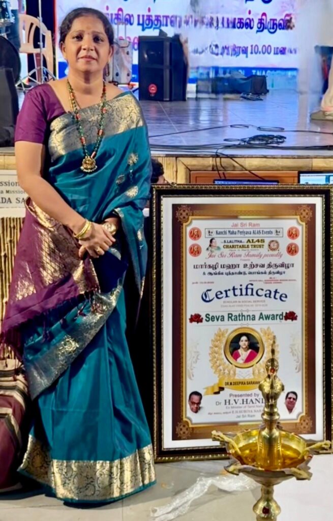 Dr. M. Deepika Saravanan, a resident of Nanganallur, was honoured with the Seva Rathna Award for her dedicated service to society. The award was presented by Dr. H. V. Hande, former health minister of Tamil Nadu.
