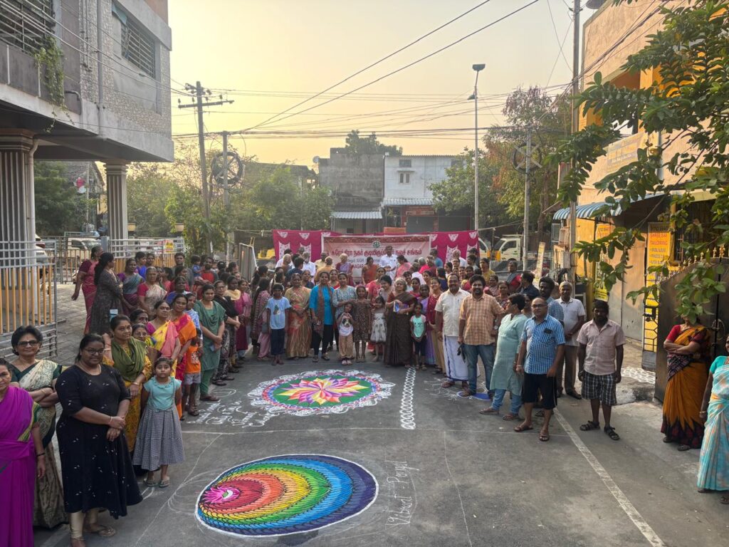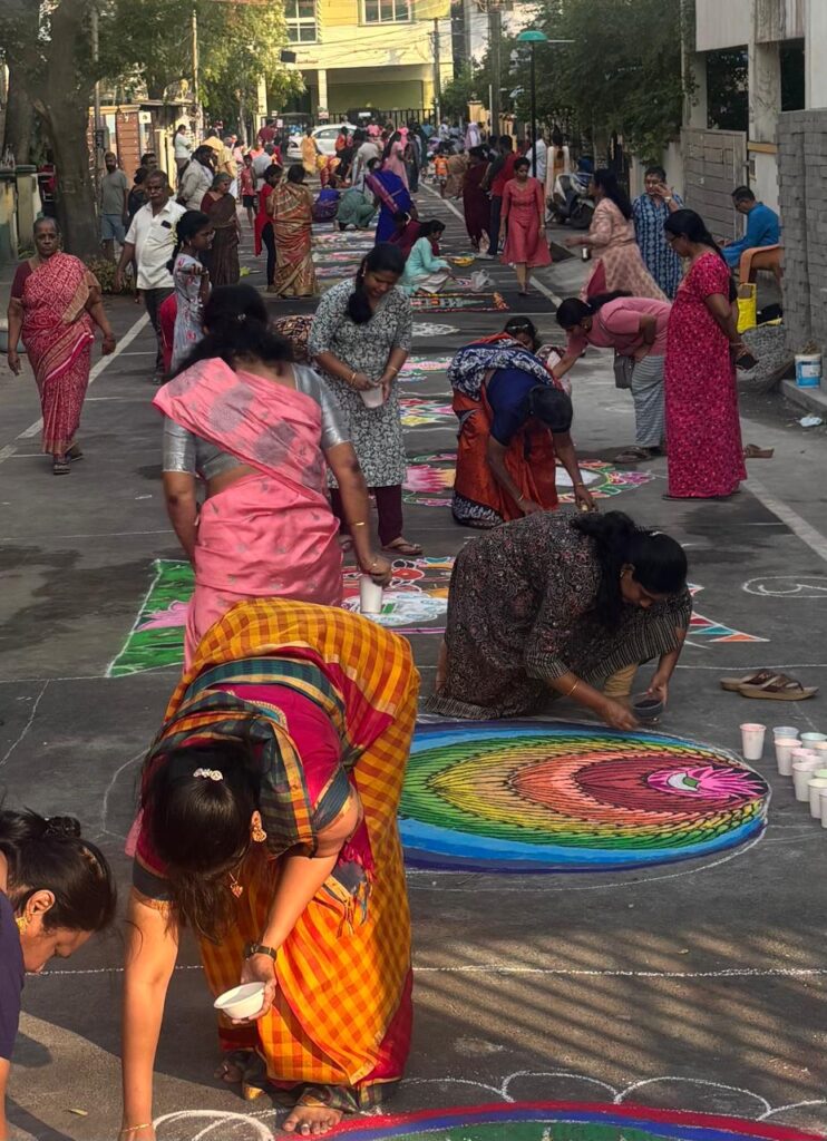 The event began at 3 pm and saw enthusiastic participation from more than 50 residents. Hundreds of visitors gathered to watch, turning the entire street into a beautiful display of traditional kolam designs.