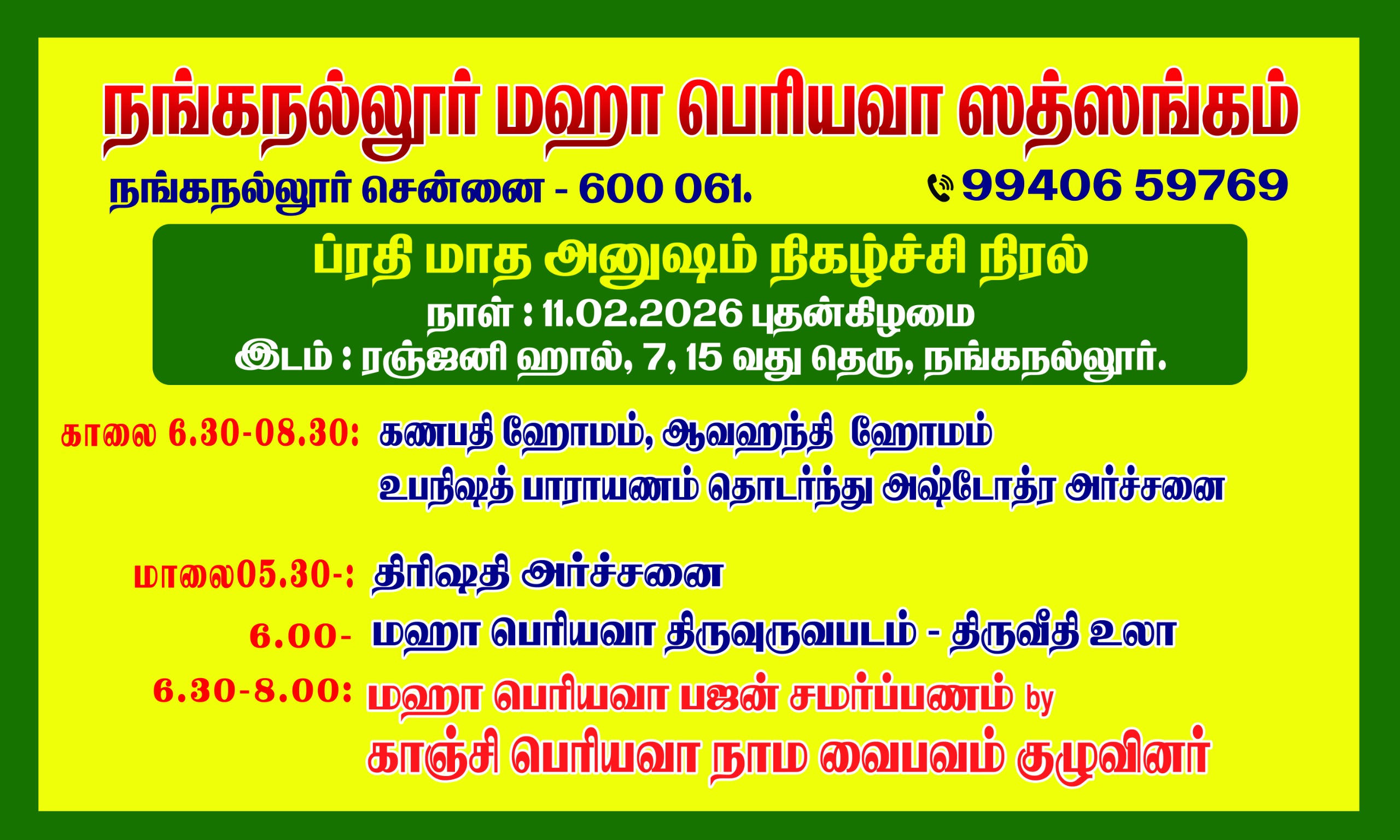 ஸ்ரீ ஸ்ரீ ஸ்ரீ மஹா பெரியவா ப்ரதி மாத அனுஷம் நிகழ்ச்சி வருகிற 11ம் தேதி பிப்ரவரி 2026, புதன்கிழமை, ரஞ்ஜனி ஹால், 7, 15 வது தெரு, நங்கநல்லூரில் நடைபெறவுள்ளது.