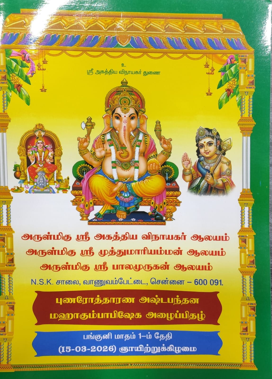 வாணுவம்பேட்டை, என்.எஸ்.கே சாலையில் உள்ள அருள்மிகு ஸ்ரீ அகத்திய விநாயகர் ஆலயம், அருள்மிகு ஸ்ரீ முத்துமாரியம்மன் ஆலயம் மற்றும் அருள்மிகு ஸ்ரீ பாலமுருகன் ஆலயத்தில் அஷ்டபந்தன மகா கும்பாபிஷேகம் நடைபெற உள்ளது. இந்த நிகழ்ச்சி பங்குனி மாதம் 1-ம் தேதி, 15 மார்ச் 2026 அன்று நடைபெற உள்ளது.