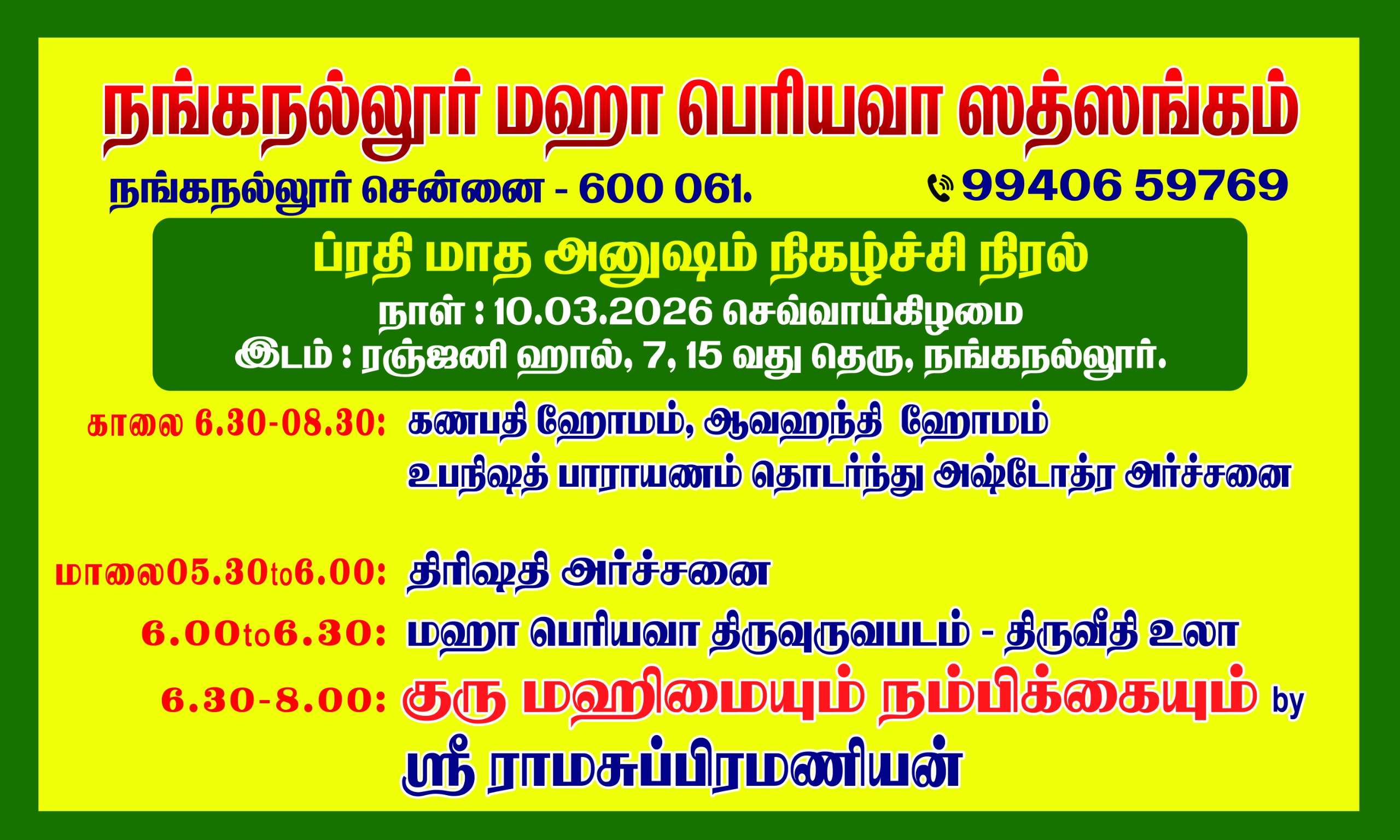 |ச வெங்கடேஸ்வரன்| நங்கநல்லூர் மஹா பெரியவா ஸத்ஸங்கம் வழங்கும் ஸ்ரீ ஸ்ரீ ஸ்ரீ மஹா பெரியவா ப்ரதி மாத அனுஷம் நிகழ்ச்சி வருகிற 10ம் தேதி மார்ச் 2026, செவ்வாய்க்கிழமை…