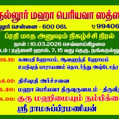 |ச வெங்கடேஸ்வரன்| நங்கநல்லூர் மஹா பெரியவா ஸத்ஸங்கம் வழங்கும் ஸ்ரீ ஸ்ரீ ஸ்ரீ மஹா பெரியவா ப்ரதி மாத அனுஷம் நிகழ்ச்சி வருகிற 10ம் தேதி மார்ச் 2026, செவ்வாய்க்கிழமை