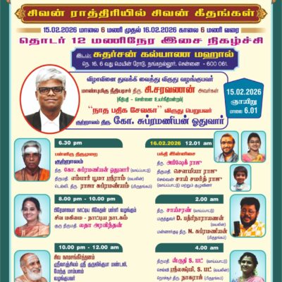 | S VENKATESHWARAN | On the occasion of Maha Sivarathri, Naadhabrahmam IsaiNatya Kalanchiyam organised a 12-hour continuous specialmusic programme, titled