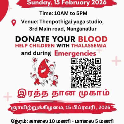 Online NGO #greenNanganallur, along with Rotary CentralTTK-VHS Blood Bank, is organising its 13th blood donationcamp to help children suffering from